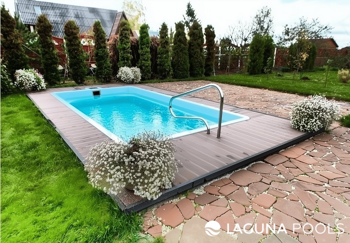 Композитный прямоугольный бассейн с террасной доской и металлическим поручнем на участке