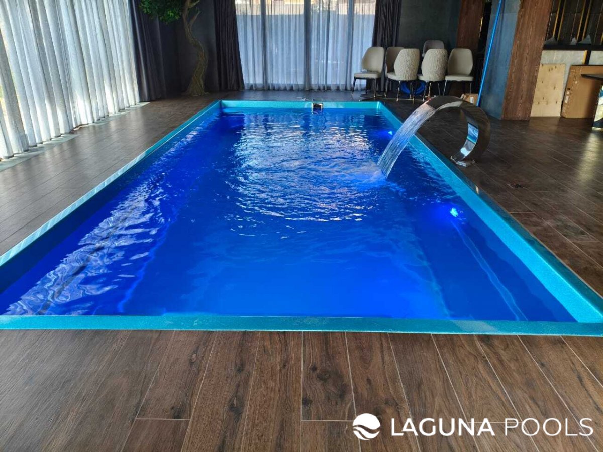 Крытый прямоугольный бассейн с подсветкой и нержавеющим водопадом в комнате