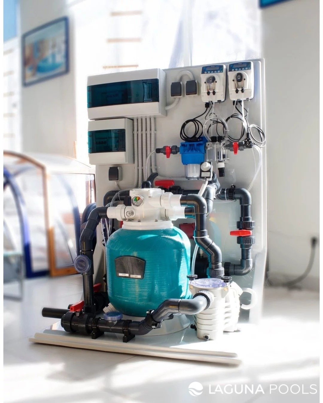 Стенд с оборудованием для фильтрации и дозирования реагентов в бассейне